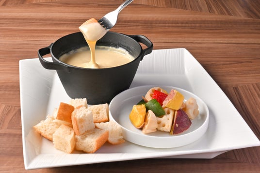 具材は一口サイズにカットしたさつま芋、レンコン、パプリカ、フランスパンなどをご提供。お好みの具材に付けて召し上がれば、滑らかなチーズの舌触りと共に、口いっぱいに広がる濃厚なチーズの味わいをご堪能いただけます。