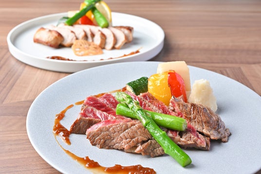 ランチにはポークステーキ、ディナーにはビーフステーキをご提供いたします。焼きたてならではの贅沢な味わいをお楽しみください。