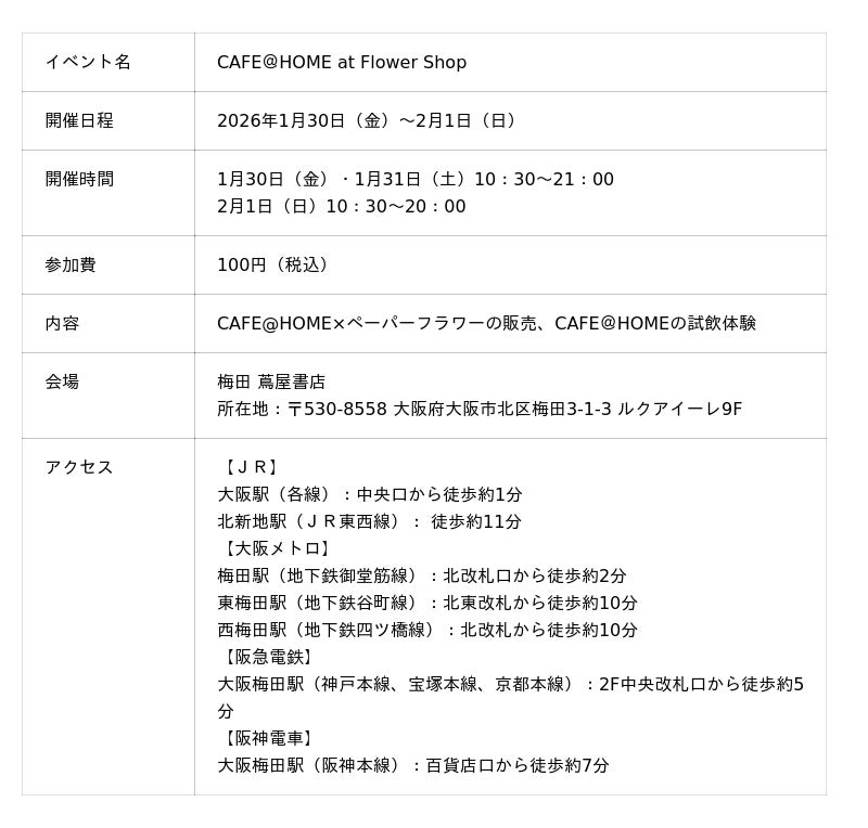 COFFEE STYLE UCC株式会社(本社:兵庫県神戸市、代表取締役社長:西本圭吾)は、東京での開催時に5日間で約4,000個の販売を記録し好評をいただいた体験型ショップ「CAFE@HOME at Flower Shop」を、2026年1月30日(金)から2月1日(日)までの3日間、梅田 蔦屋書店にて開催します。
