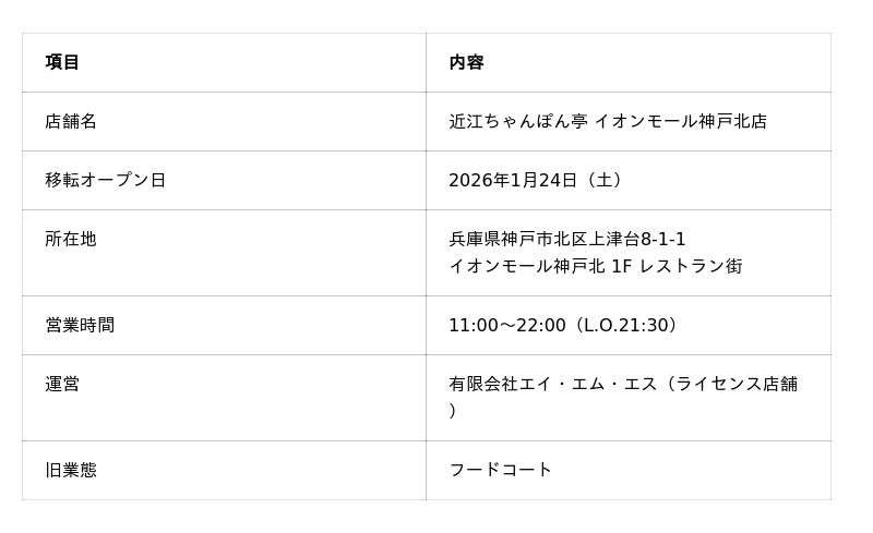 ライセンス店舗「近江ちゃんぽん亭 イオンモール神戸北店」が、