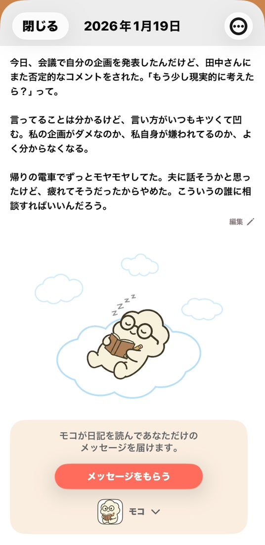 雲の国からやってきたゆるキャラのモコ(AI)が、ユーザーの日記を読んで優しく寄り添ったメッセージを届けてくれる日記アプリです。