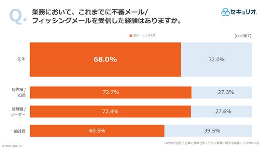 調査の結果、経営層(役員クラス以上)のセキュリティインシデント経験率が一般社員を大きく上回る実態や、セキュリティ教育が実際の行動変容に結びついていない実態が明らかになりました。