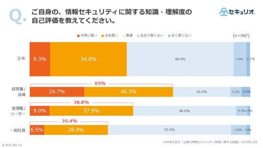 自身のセキュリティ知識について「高い(非常に高い+まあ高い)」と答えた割合は経営層で65.0%(全体平均:44.1%)に達しました。