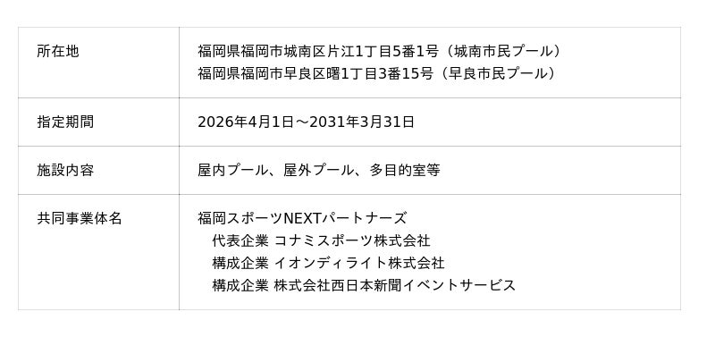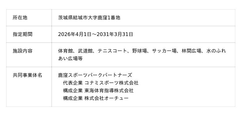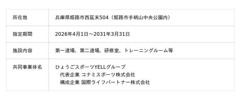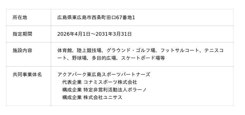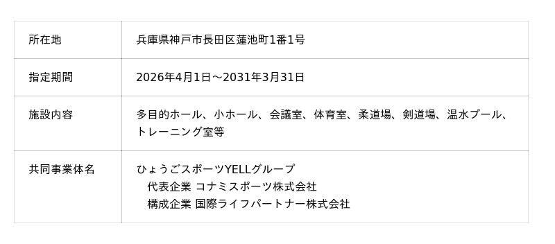 これにより2026年4月1日(水)から、「結城市鹿窪運動公園」「八王子市甲の原体育館」「兵庫県立文化体育館」「兵庫県立武道館」「東広島運動公園」「福岡市立城南市民プール・福岡市立早良市民プール」の運営を行う予定です。