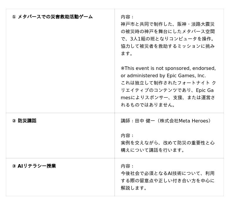 株式会社Meta Heroes(本社所在地:大阪府大阪市、代表取締役:松石和俊、以下「当社」)は、2026年1月29日(木)、神戸市立岩岡中学校(兵庫県神戸市)にて、メタバースやAI技術を活用した「未来型・防災授業」を実施いたします。神戸市立の学校において、当社の防災メタバース授業が導入されるのは今回が初の試みとなります。