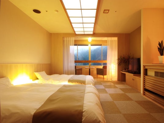 客室で温泉をたのしめる温泉半露天風呂付客室<かわみ>(2023年リニューアル)をはじめ、素足で過ごせる「和モダンツイン」客室などのベッドタイプの客室や、日本らしい従来の布団タイプの純和室などバリエーション豊かな客室があり、思い思いの時間をお過ごしいただけます。