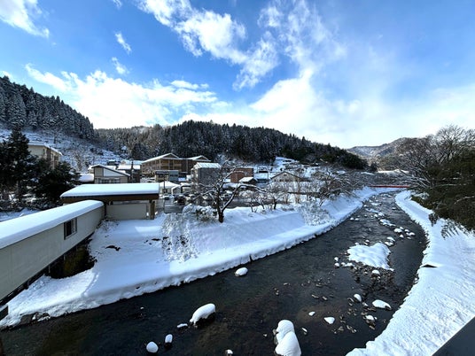 山陰湯村温泉 湧泉(ゆうせん)の宿ゆあむ 目の前を流れる春来川(はるきがわ)~雪の日~(※天候により雪がない場合もございます)