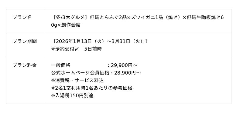 「アイアンドエフ・ビルディング株式会社(本社:大阪市北区、代表取締役:泉 邦治)が運営するビナリオホテルズ&リゾーツの施設である「山陰湯村温泉 湧泉(ゆうせん)の宿ゆあむ」(兵庫県)では、冬の味覚<但馬とらふぐ・ズワイガニ・但馬牛>を楽しむことができる、冬の3大グルメプランを【2026年1月13日(火)~3月31日(火)の月曜日から金曜日限定】でご提供いたします。