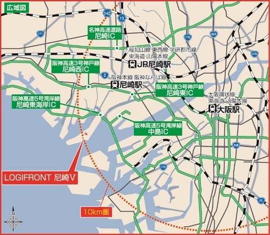 本施設は、阪神高速道路5号湾岸線「尼崎東海岸」IC約1.8km、阪神高速道路3号神戸線「尼崎東」IC約4.5kmに位置し、複数の高速道路が利用可能な立地となっています。また、大阪港・神戸港、伊丹空港へのアクセスも良好で、広域輸送が可能です。また、都市部の地域配送においても利用頻度が高い主要幹線の第二阪神国道へ五合橋線経由で出ることができ、大阪市内中心部へのアクセスに優れた交通利便性を備えています。