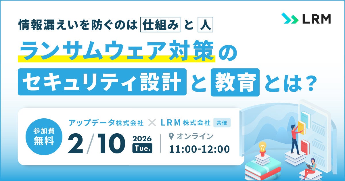 LRM株式会社(本社:兵庫県神戸市、代表取締役CEO:幸松哲也)、アップデータ株式会社(本社:東京都中央区、代表取締役社長:小川敦)は、2026年2月10日(火)11時から、ランサムウェア対策のセキュリティ設計と教育に関するセミナーを無料開催します。