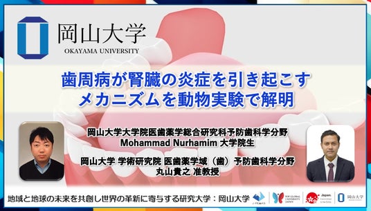国立大学法人岡山大学(本部:岡山市北区、学長:那須保友)の大学院医歯薬学総合研究科予防歯科学分野のMohammad Nurhamim大学院生、岡山大学学術研究院医歯薬学域(歯)予防歯科学分野の丸山貴之准教授・江國大輔教授、および宝塚医療大学の森田学教授らの研究グループは、歯周病を発症したラットに高発現したmicroRNAが、血流を介して腎臓に到達し、腎臓において炎症に関与する遺伝子の発現を調節することを解明しました。