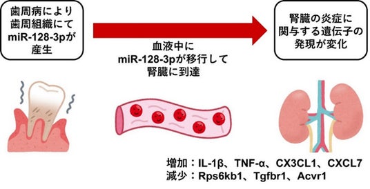 - 今回、動物実験において、歯周病を発症したラットに高発現したmicroRNAが、血流を介して腎臓に到達し、腎臓において炎症に関与する遺伝子の発現を調節することを解明しました。