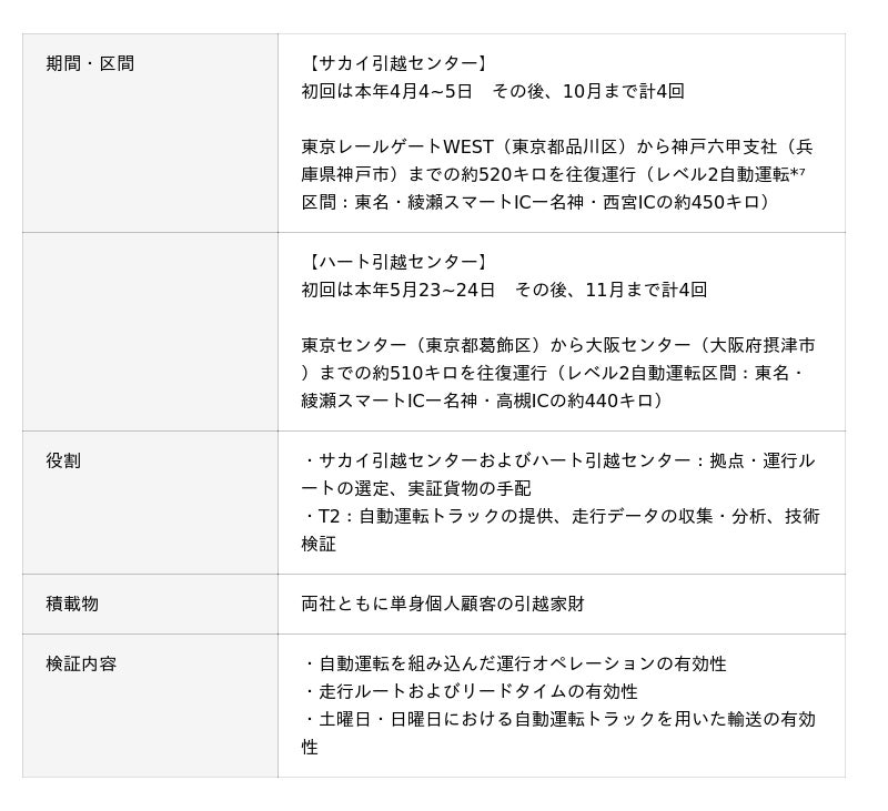 株式会社サカイ引越センター(大阪府堺市、代表取締役社長:田島 哲康、以下「サカイ引越センター」)、株式会社ハート引越センター(東京都葛飾区、代表取締役社長:太田 至計、以下「ハート引越センター」)および株式会社T2(東京都千代田区、代表取締役CEO:熊部 雅友、以下「T2」)は、将来的なドライバー不足による「引越し難民」への新たな対策として、本年4月より、引越業界で初めて*¹となる、自動運転トラックを用いて家財を輸送する実証を、関東ー関西間の高速道路一部区間で開始します。
