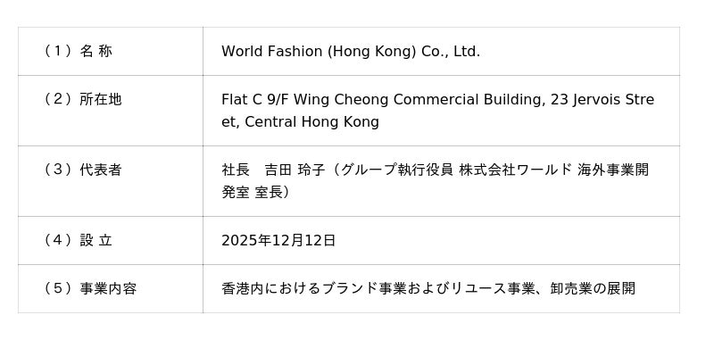 株式会社ワールド(本社:神戸市、代表取締役 社長執行役員:鈴木信輝)は、アジア市場への本格展開を加速させるため、2025年12月12日に香港現地法人World Fashion (Hong Kong) Co., Ltd.を設立いたしました。