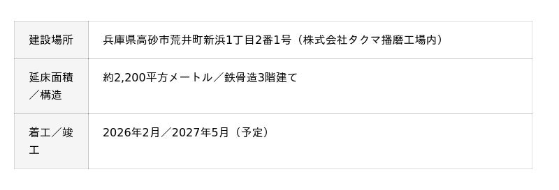 株式会社タクマ(本社:兵庫県尼崎市、社長:濱田州朗)は、このほど、ボイラの生産拠点である播磨工場(兵庫県高砂市)における「新研究棟(仮称)」の建設工事に着工しました。竣工は2027年5月の予定です。新研究棟には、環境に関する測定・分析サービスを提供する当社グループ会社の株式会社環境ソルテック(本社:兵庫県高砂市、社長:宇野晋)が移転し、業務機能の強化を図ります。