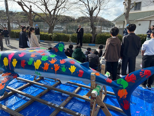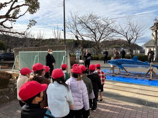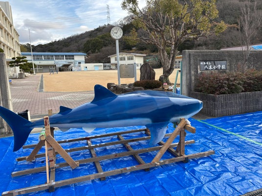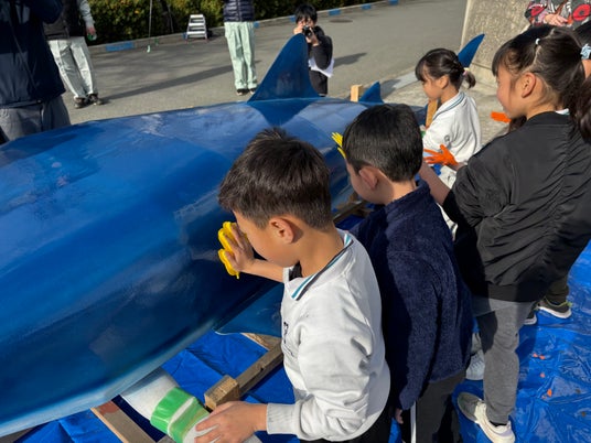 当社は「環境プラント」を納入する会社。「理工系離れ」対策の一助となるようその製缶・溶接技術を活用して全長2.5メートルの鉄のジンベイザメを設計・製造、1/20(火)に子供たちが素敵に仕上げてくれました