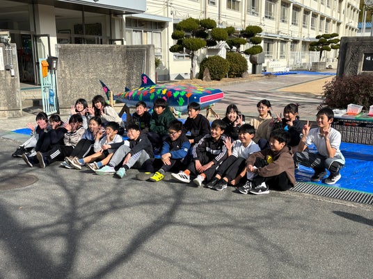 さる1月20日(火)9:30~12:00、姫路市立八木小学校にて、当社の若手社員が設計・製造した全長約2.5メートルの「鉄の巨大ジンベイザメ」のオブジェに、姫路市立八木小全生徒(約90名)が色とりどりの絵の具で手形をつけ、とても素敵に完成させてくれましたので報告します。