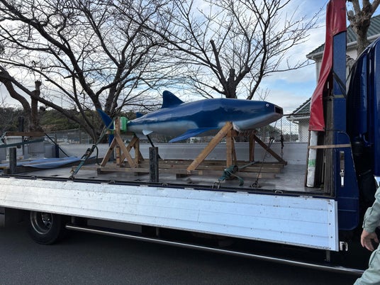 8:30 ジンベイザメオブジェが八木小学校前に到着、イベント準備を開始