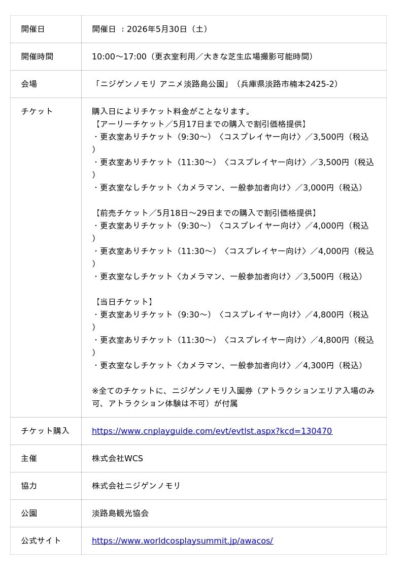 淡路島アニメパーク「ニジゲンノモリ」では、世界最大級のコスプレイベント「世界コスプレサミット」を主催する株式会社WCSに協力し、コスプレイベント『第3回 淡路島COSPLAY~アワコス~ Powered by 世界コスプレサミット』を2026年5月30日(土)に開催いたします。